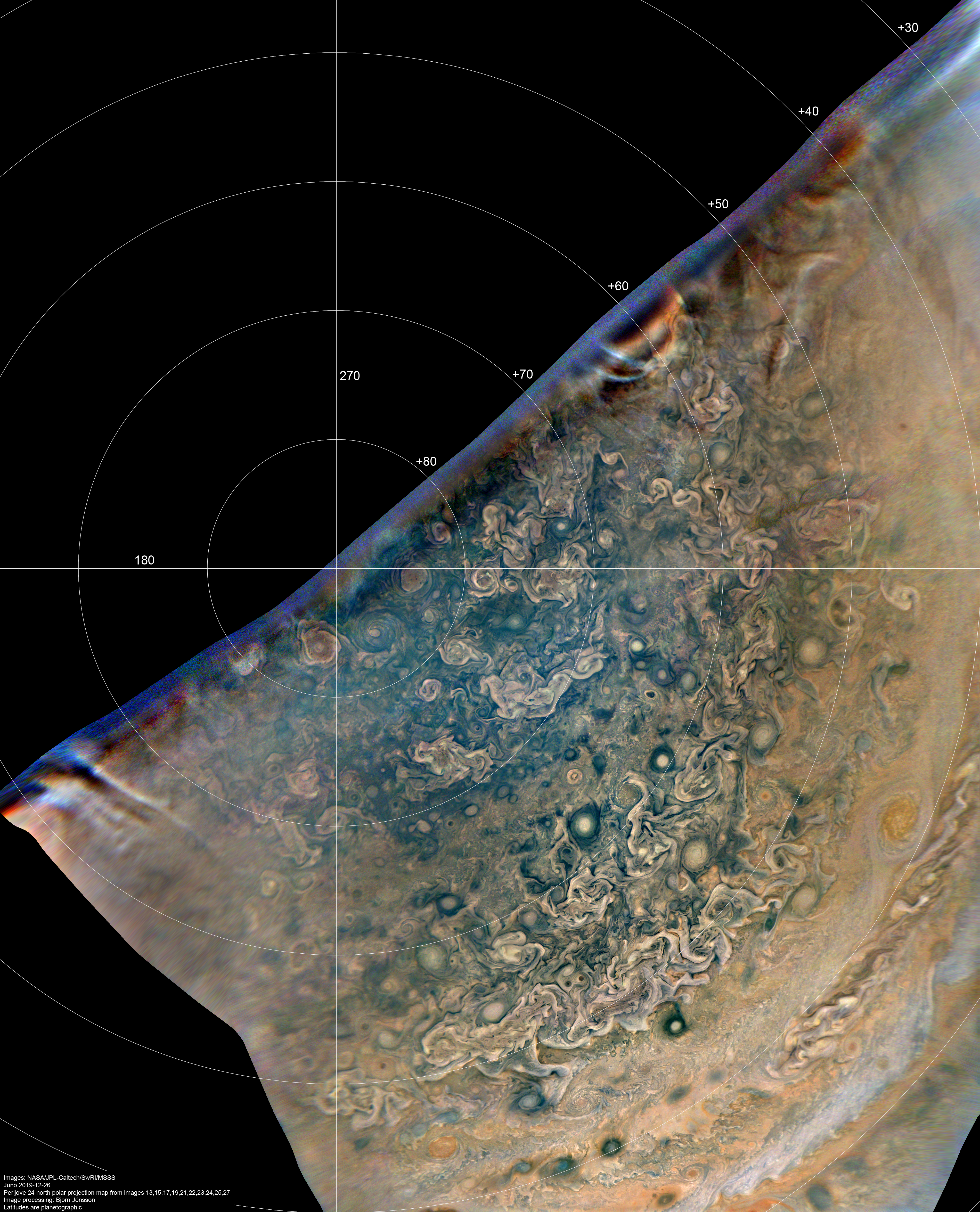 A north polar projection map mosaic from ten perijove 24 images. The map has been heavily processed to reveal various features that are not obvious in the true color/contrast version of this map. In particular some of haze bands in the north polar region are more obvious here. The large scale color and brightness variations in this image are probably relatively inaccurate, especially near the terminator.