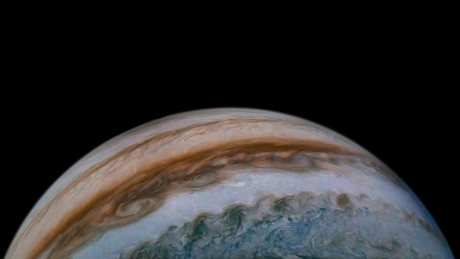 Processed using the JunoCam imager's PJ24 JET S3 raw images and data from NASA's Juno spacecraft flyby on December 26, 2019. Enhanced to highlight features, clouds, colours, and the beauty of Jupiter. Artist's impression - not representative of true colour.