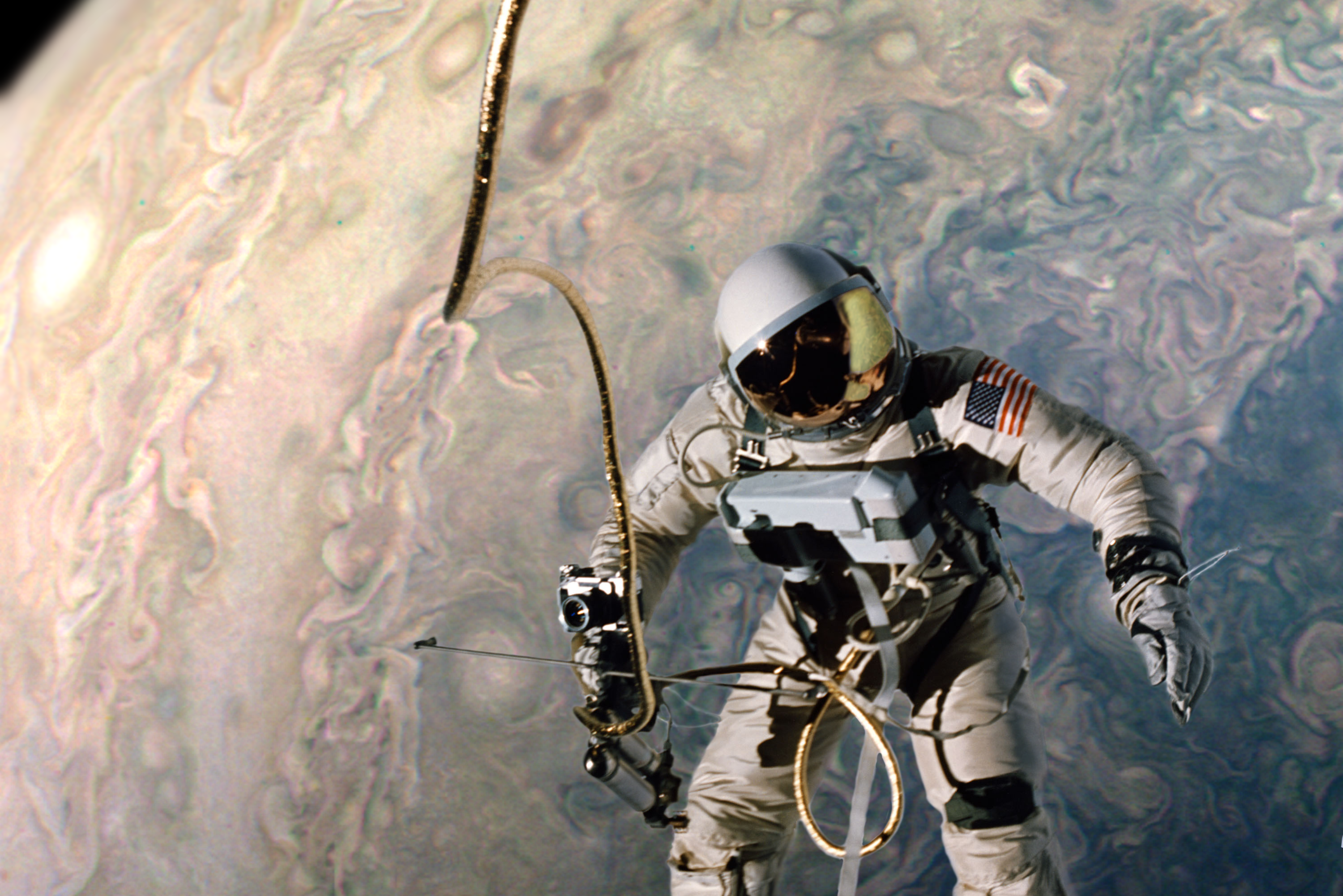 Thinking forward to a manned mission to Jupiter, I combined a Gemini spacewalk image with a processed Jupiter South pole image. The original is here: https://www.missionjuno.swri.edu/junocam/processing?id=634