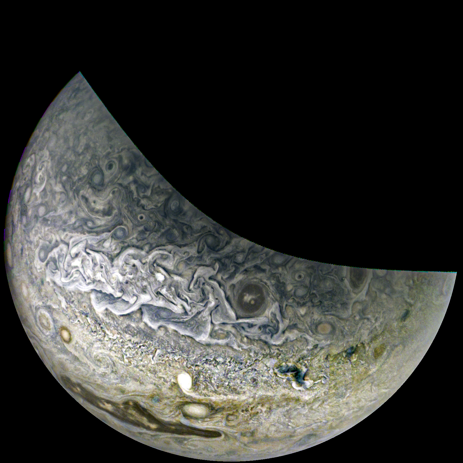 Junocam pixels are 12 bits deep from the camera but are converted to 8 bits inside the instrument using a lossless "companding" table, a process similar to gamma correction, to reduce their size. All Junocam products on the missionjuno website are in this 8-bit form as received on Earth. Scientific users interested in radiometric analysis should use the "RDR" data products archived with the Planetary Data System, which have been converted back to a linear 12-bit scale.