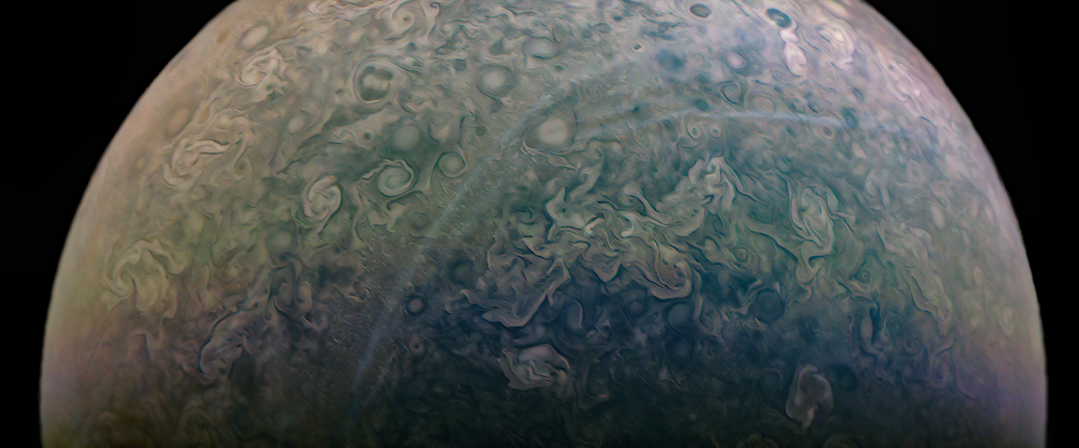 Junocam pixels are 12 bits deep from the camera but are converted to 8 bits inside the instrument using a lossless "companding" table, a process similar to gamma correction, to reduce their size. All Junocam products on the missionjuno website are in this 8-bit form as received on Earth. Scientific users interested in radiometric analysis should use the "RDR" data products archived with the Planetary Data System, which have been converted back to a linear 12-bit scale.