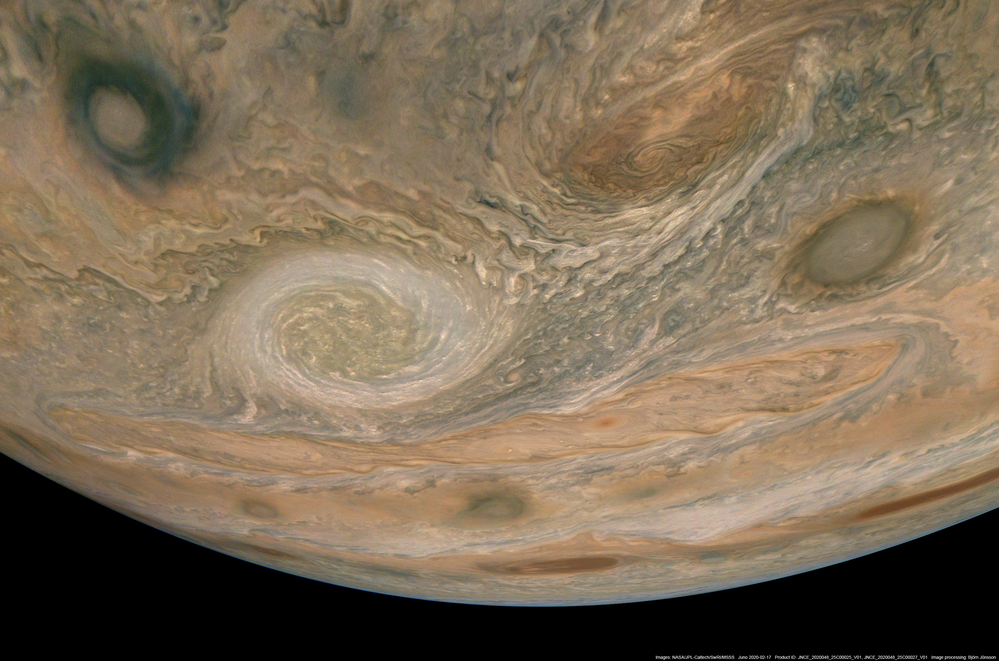 An enhanced mosaic processed from PJ25 images 25 and 27. The mosaic shows Jupiter as seen from Juno at the time when image PJ25_27 was obtained but data from image PJ25_25 was added to show a bigger area to the north. This is a very wide angle mosaic that has a field of view of 94 degrees. Most of the mosaic comes from image 27 but roughly the uppermost quarter is from image 25. The conspicuous anticyclonic oval left of center is known as NN-WS-4. It is about 7000 km across and is at planetographic latitude 41.5 degrees north. North is up.