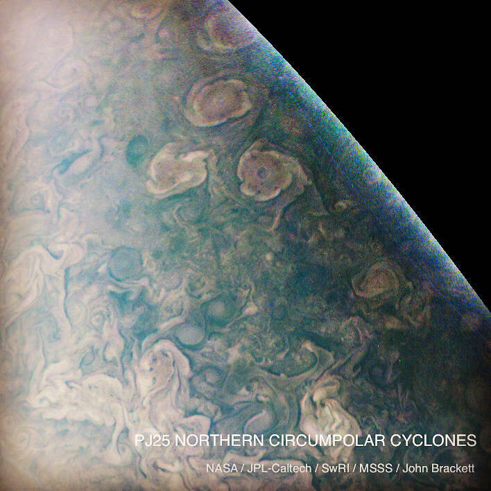 Enhanced image of multiple cyclones around Jupiter’s North Pole.