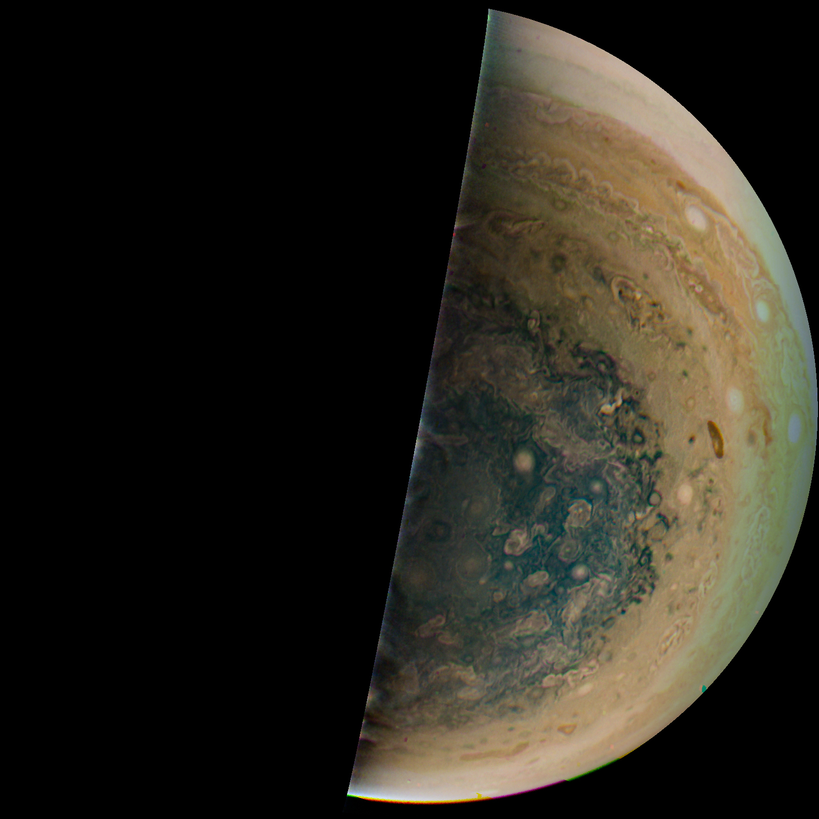 Junocam pixels are 12 bits deep from the camera but are converted to 8 bits inside the instrument using a lossless "companding" table, a process similar to gamma correction, to reduce their size. All Junocam products on the missionjuno website are in this 8-bit form as received on Earth. Scientific users interested in radiometric analysis should use the "RDR" data products archived with the Planetary Data System, which have been converted back to a linear 12-bit scale.