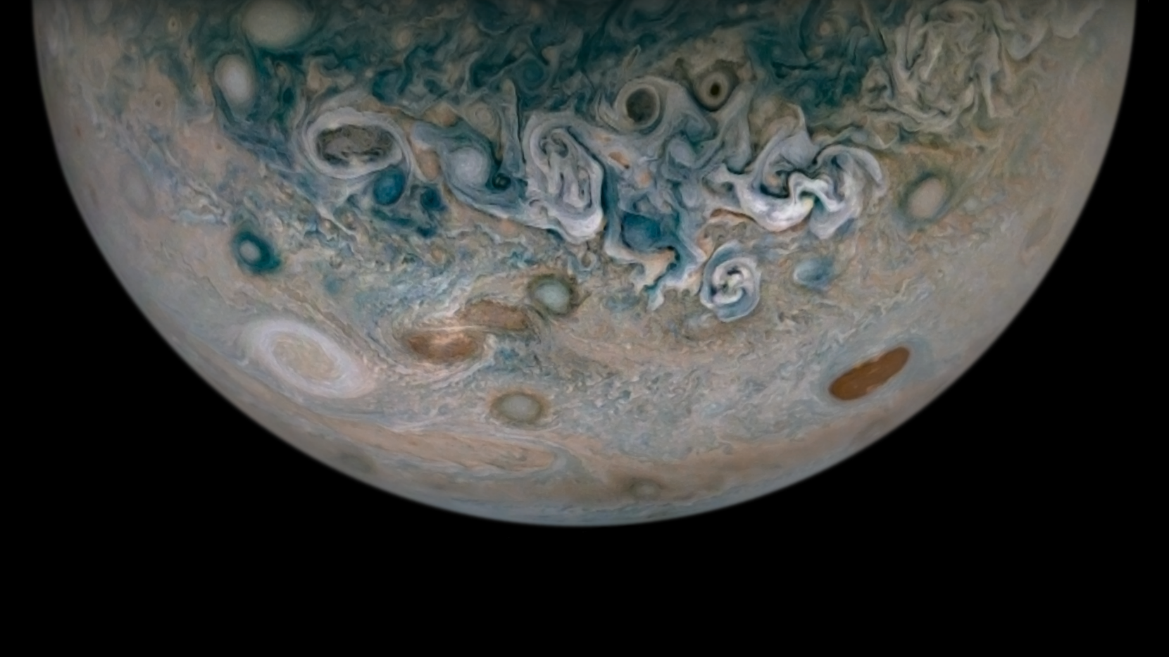 Processed using the JunoCam imager's PJ25 Folded Filamentary Region North raw images and data from NASA's Juno spacecraft flyby on February 17, 2020. Enhanced to highlight features, clouds, colours, and the beauty of Jupiter. Artist's impression - not representative of true colour.