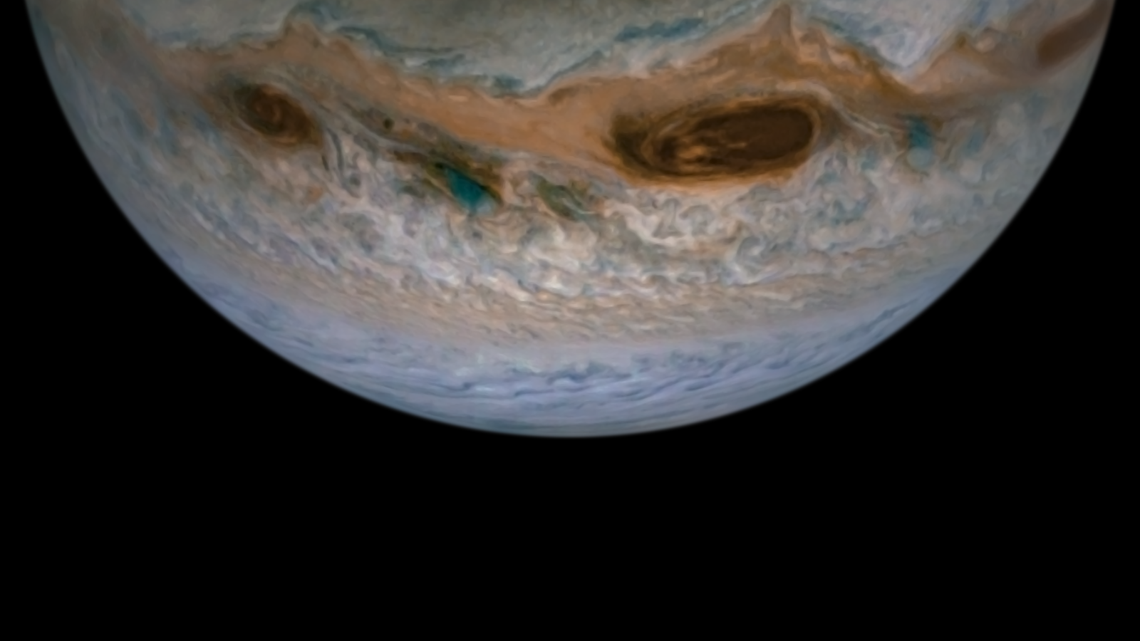 Processed using the JunoCam imager's PJ25 JET N2 raw images and data from NASA's Juno spacecraft flyby on February 17, 2020. Enhanced to highlight features, clouds, colours, and the beauty of Jupiter. Artist's impression - not representative of true colour.