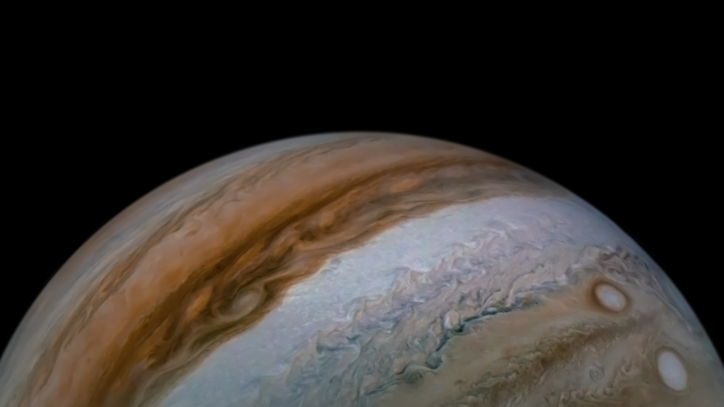 Processed using the JunoCam imager's PJ25 JET S2 raw images and data from NASA's Juno spacecraft flyby on February 17, 2020. Enhanced to highlight features, clouds, colours, and the beauty of Jupiter. Artist's impression - not representative of true colour.