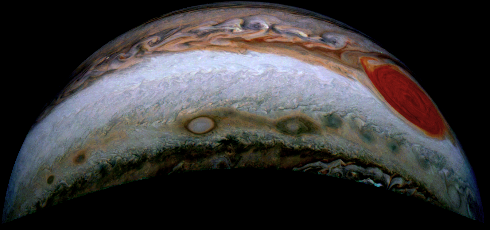 This image comprises several turbulent features of the Jovian atmosphere: vortices, jets, unstable motions. Their locations and perspective give a pretty attractive composition. (Modified with GIMP, Linux).
