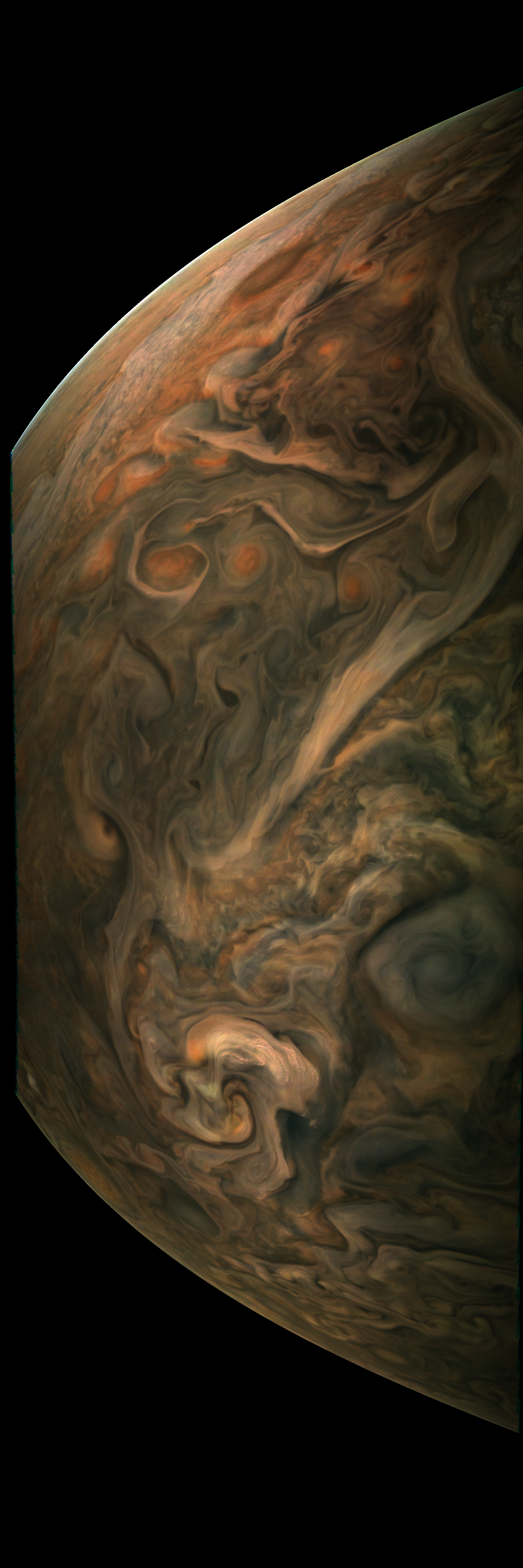 Junocam pixels are 12 bits deep from the camera but are converted to 8 bits inside the instrument using a lossless "companding" table, a process similar to gamma correction, to reduce their size. All Junocam products on the missionjuno website are in this 8-bit form as received on Earth. Scientific users interested in radiometric analysis should use the "RDR" data products archived with the Planetary Data System, which have been converted back to a linear 12-bit scale.