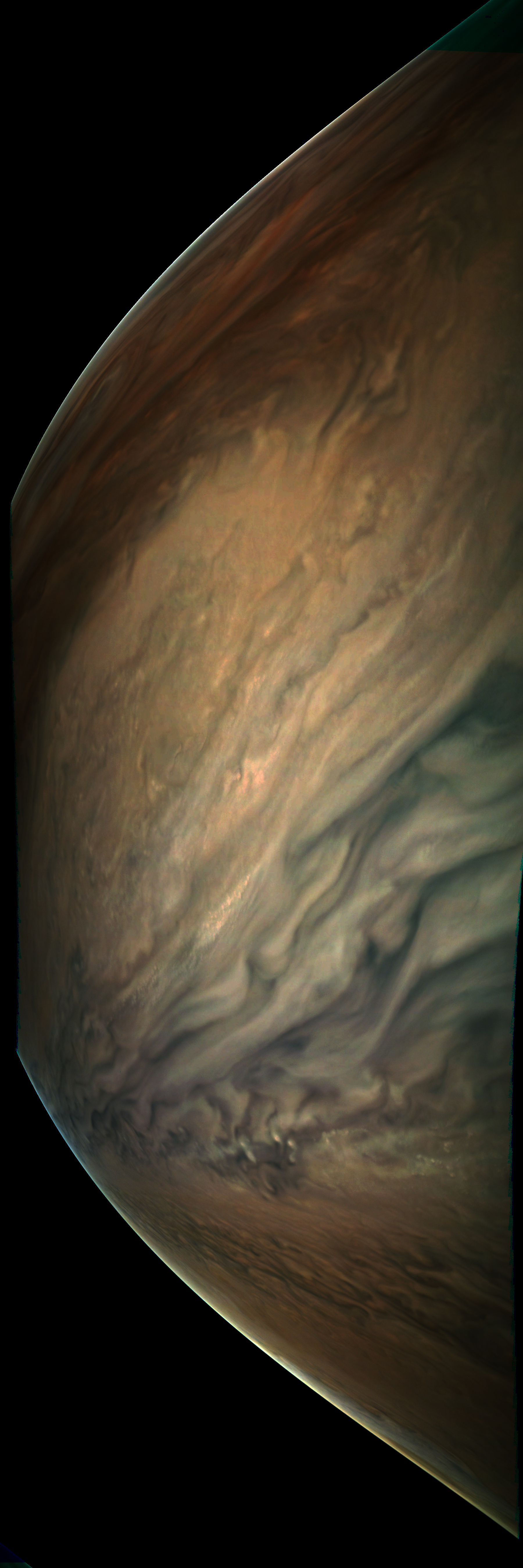 Resolution is 30 pixels per degrees in an equidistant cylindrical system centered to the camera at image stop time, with an axis parallel to Juno's spin axis. The rendered field of view is 60x180 degrees.