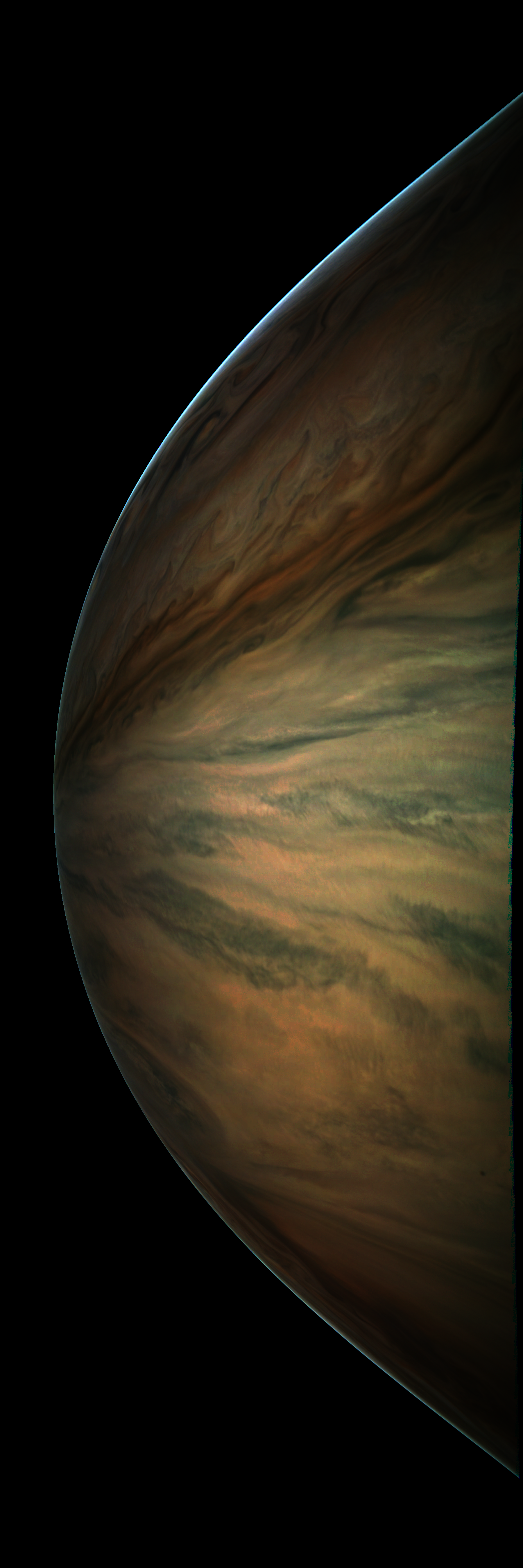 Resolution is 30 pixels per degrees in an equidistant cylindrical system centered to the camera at image stop time, with an axis parallel to Juno's spin axis. The rendered field of view is 60x180 degrees.