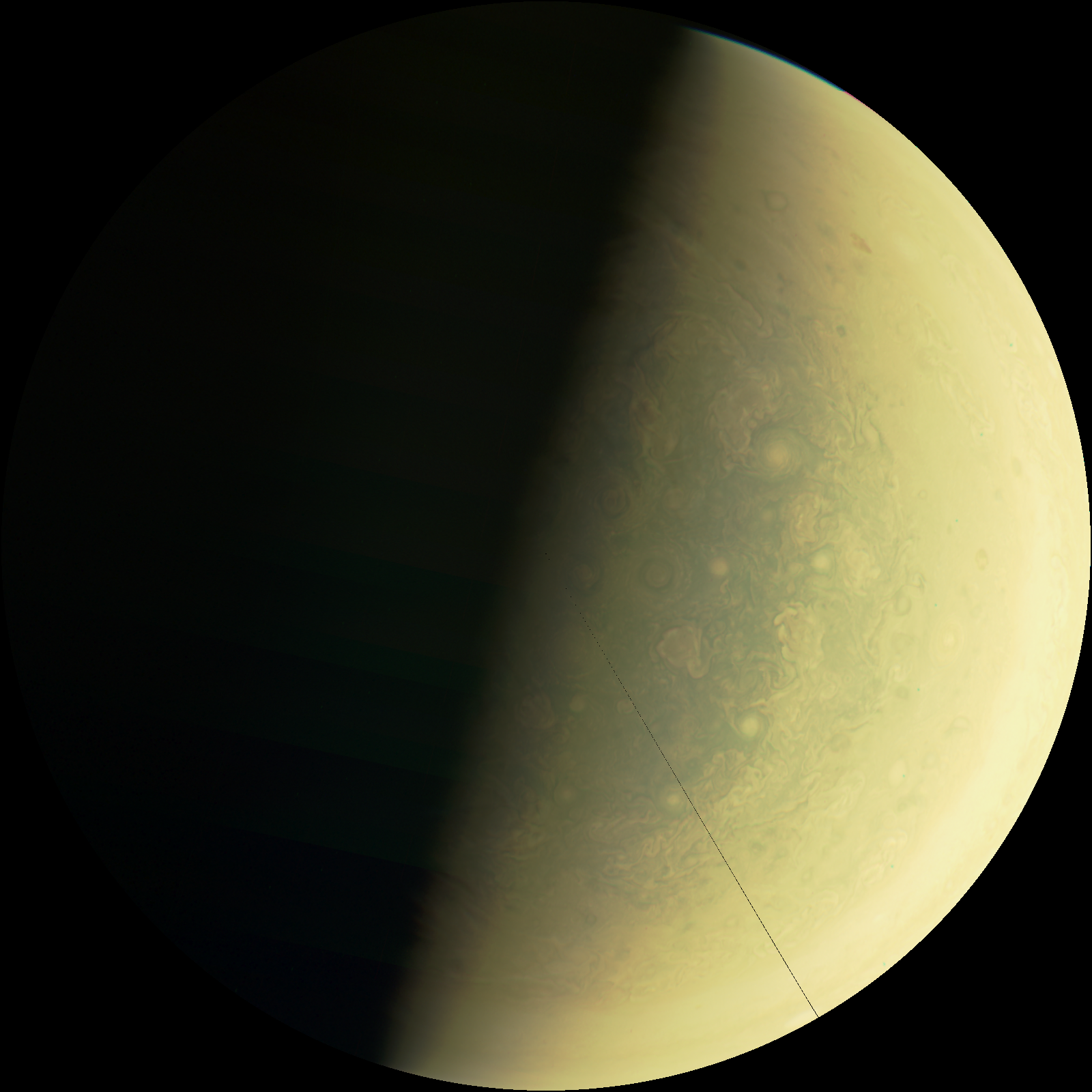 Junocam pixels are 12 bits deep from the camera but are converted to 8 bits inside the instrument using a lossless "companding" table, a process similar to gamma correction, to reduce their size. All Junocam products on the missionjuno website are in this 8-bit form as received on Earth. Scientific users interested in radiometric analysis should use the "RDR" data products archived with the Planetary Data System, which have been converted back to a linear 12-bit scale.