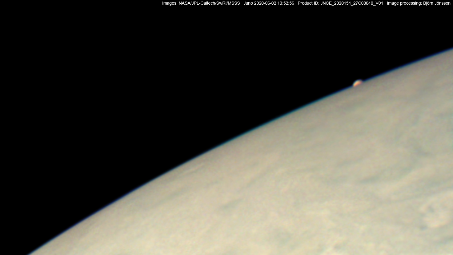 This image shows Io appearing from behind Jupiter as seen from the Juno spacecraft. In the next image obtained by JunoCam, Io had become fully visible and was more than 100 pixels from the limb.