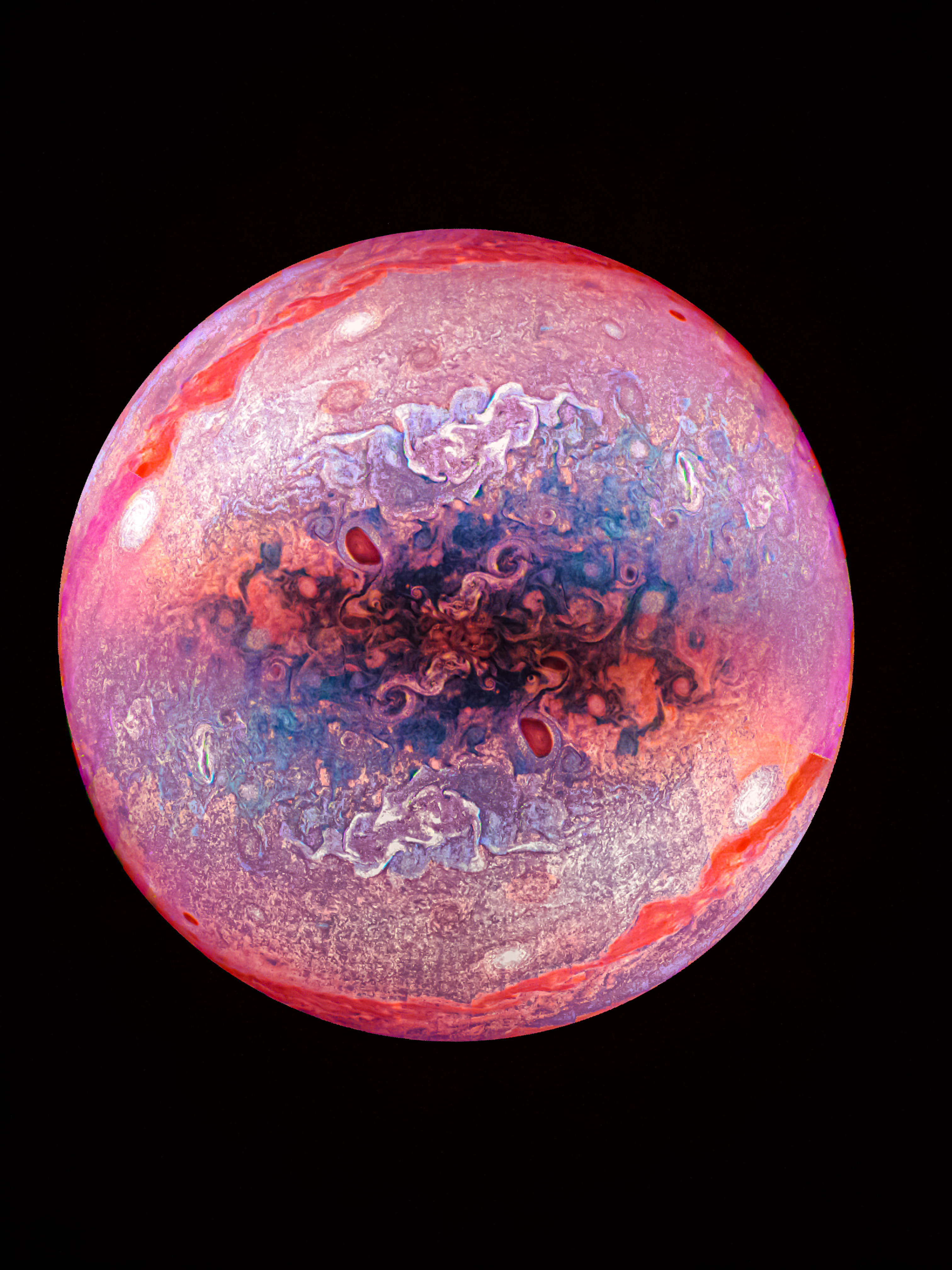 This image was processed from Juno cam raw files using adobe photoshop, lightroom, and snapseed . In this pic, same image was inverted and overlapped to give sphere shape