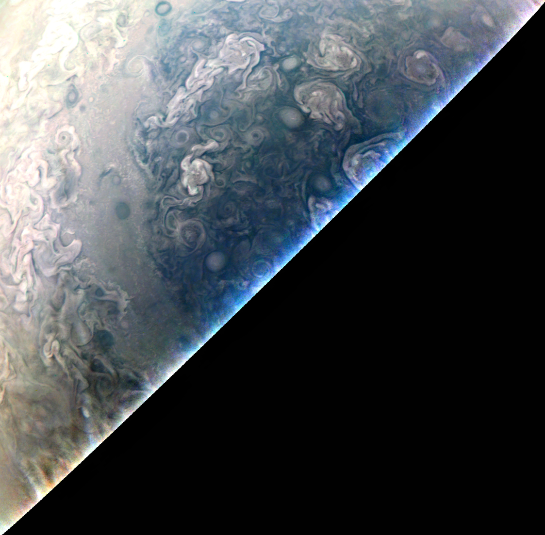 Junocam pixels are 12 bits deep from the camera but are converted to 8 bits inside the instrument using a lossless "companding" table, a process similar to gamma correction, to reduce their size. All Junocam products on the missionjuno website are in this 8-bit form as received on Earth. Scientific users interested in radiometric analysis should use the "RDR" data products archived with the Planetary Data System, which have been converted back to a linear 12-bit scale.