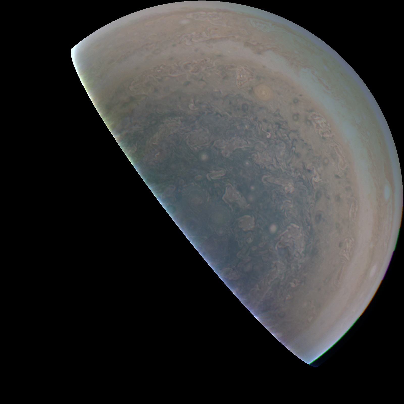 Junocam pixels are 12 bits deep from the camera but are converted to 8 bits inside the instrument using a lossless "companding" table, a process similar to gamma correction, to reduce their size. All Junocam products on the missionjuno website are in this 8-bit form as received on Earth. Scientific users interested in radiometric analysis should use the "RDR" data products archived with the Planetary Data System, which have been converted back to a linear 12-bit scale.