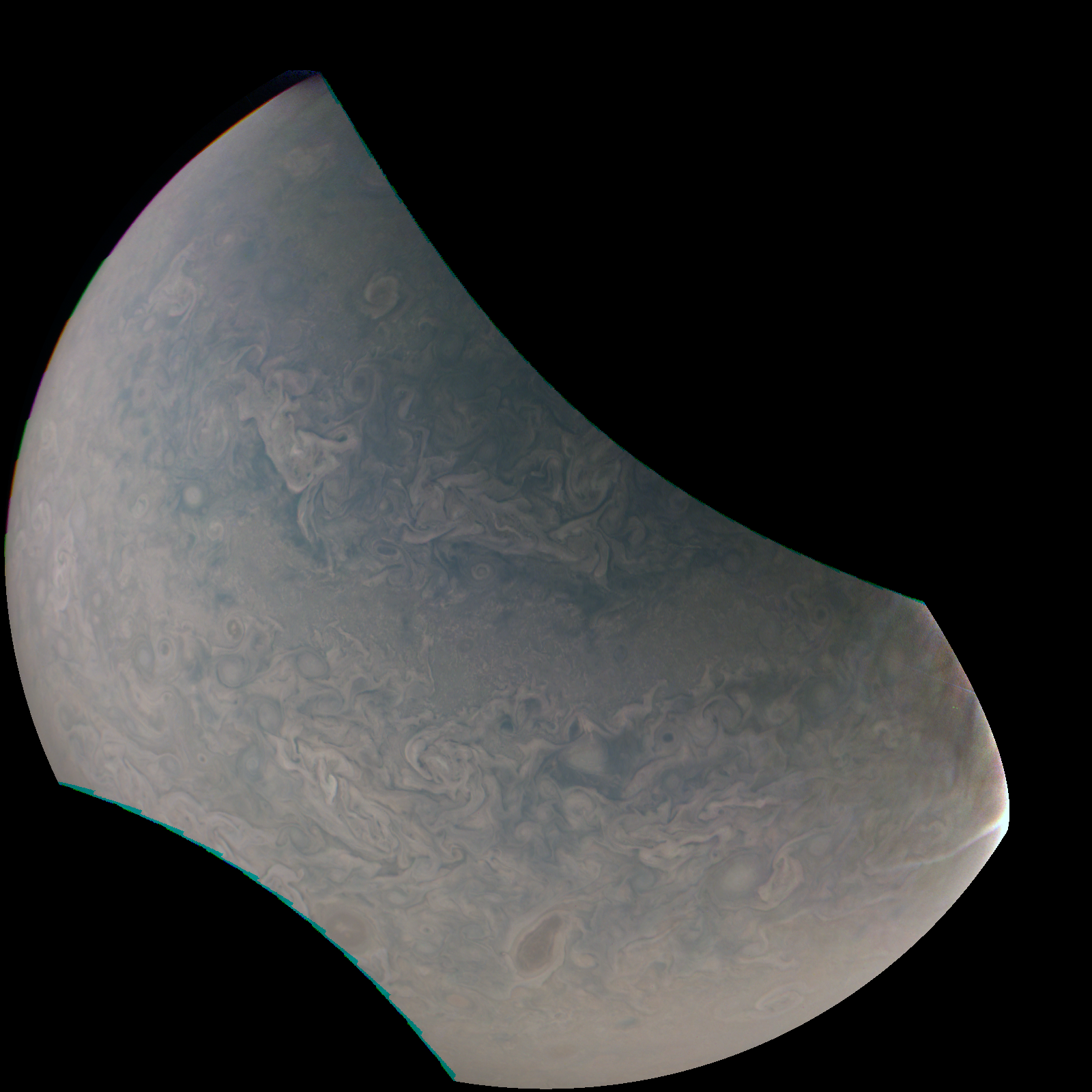 Junocam pixels are 12 bits deep from the camera but are converted to 8 bits inside the instrument using a lossless "companding" table, a process similar to gamma correction, to reduce their size. All Junocam products on the missionjuno website are in this 8-bit form as received on Earth. Scientific users interested in radiometric analysis should use the "RDR" data products archived with the Planetary Data System, which have been converted back to a linear 12-bit scale.