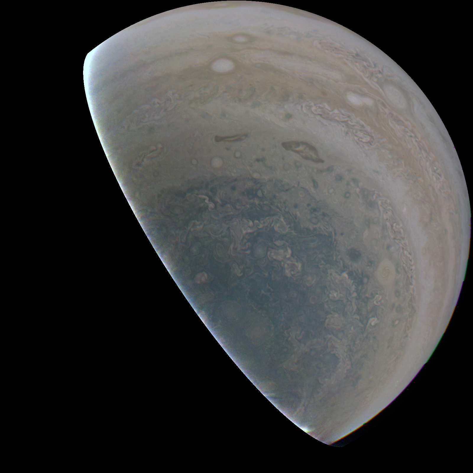 Junocam pixels are 12 bits deep from the camera but are converted to 8 bits inside the instrument using a lossless "companding" table, a process similar to gamma correction, to reduce their size. All Junocam products on the missionjuno website are in this 8-bit form as received on Earth. Scientific users interested in radiometric analysis should use the "RDR" data products archived with the Planetary Data System, which have been converted back to a linear 12-bit scale.