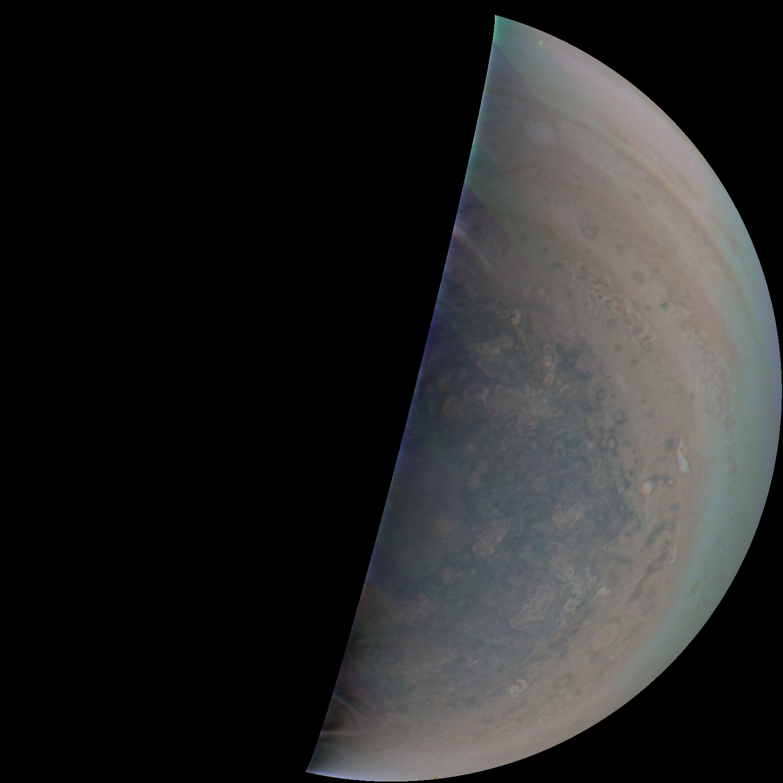 Junocam pixels are 12 bits deep from the camera but are converted to 8 bits inside the instrument using a lossless "companding" table, a process similar to gamma correction, to reduce their size. All Junocam products on the missionjuno website are in this 8-bit form as received on Earth. Scientific users interested in radiometric analysis should use the "RDR" data products archived with the Planetary Data System, which have been converted back to a linear 12-bit scale.