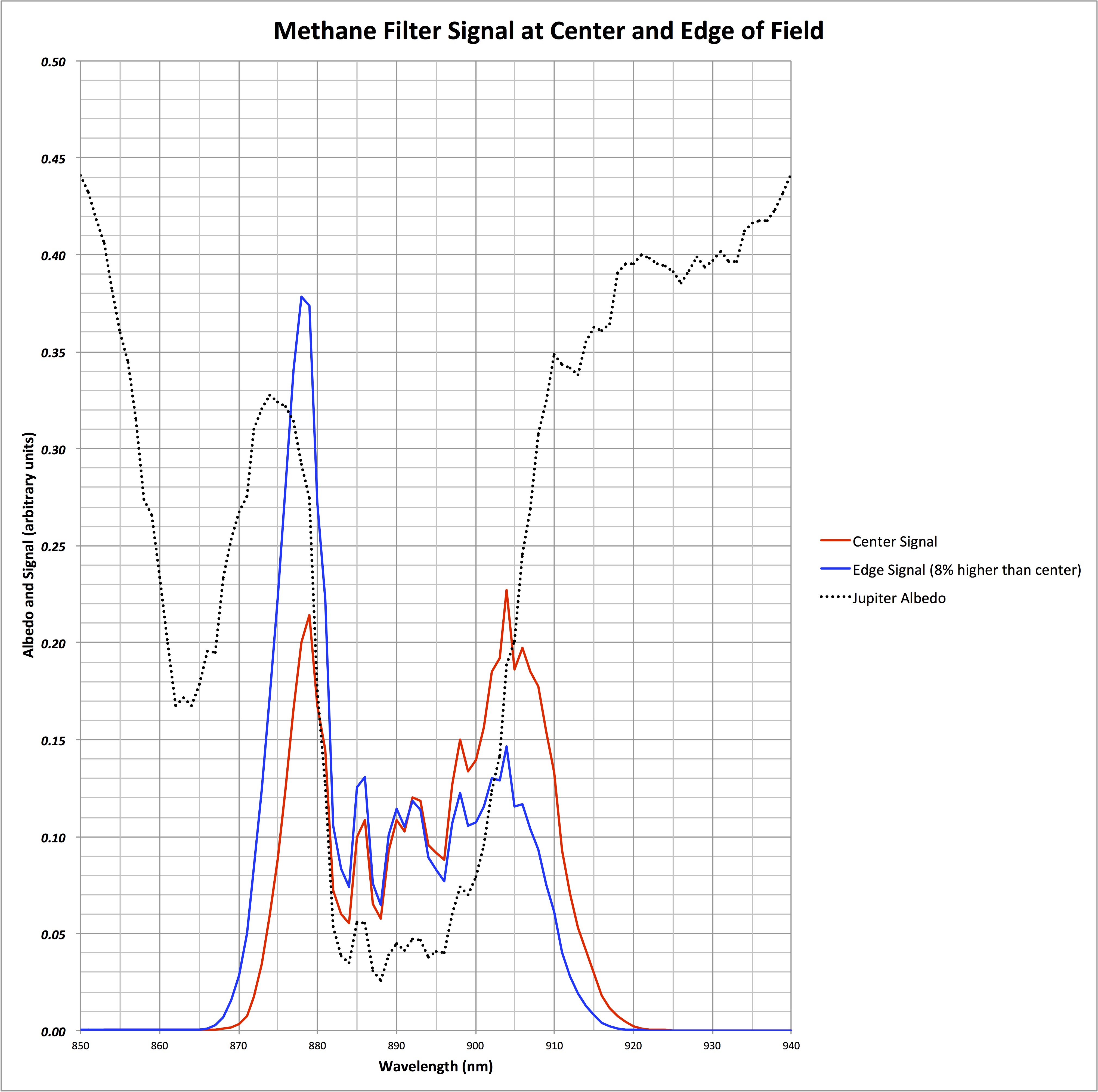The methane filter is narrow, centered on 889 nm. Features that are bright in methane images are typically found at high altitudes where light is reflected before it is absorbed.