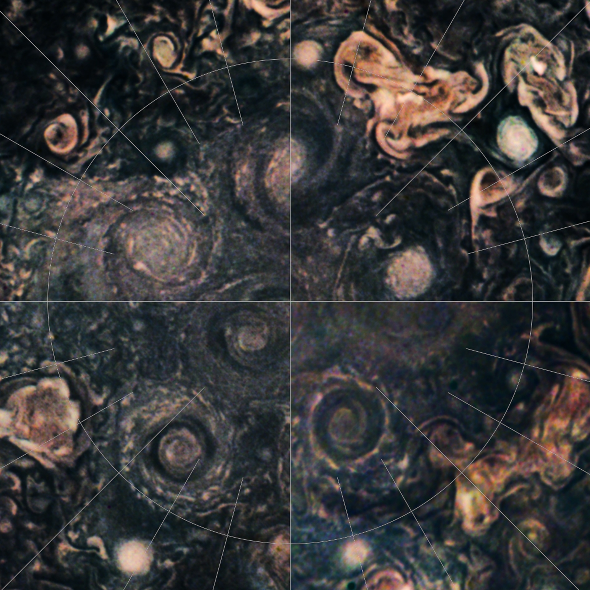 This south polar cyclone is surrounded by five circumpolar cyclones. This pentagonal pattern oscillated a bit, but in the longer run it turned out to be astonishingly stable with respect to Jupiter's L3 coordinate system.