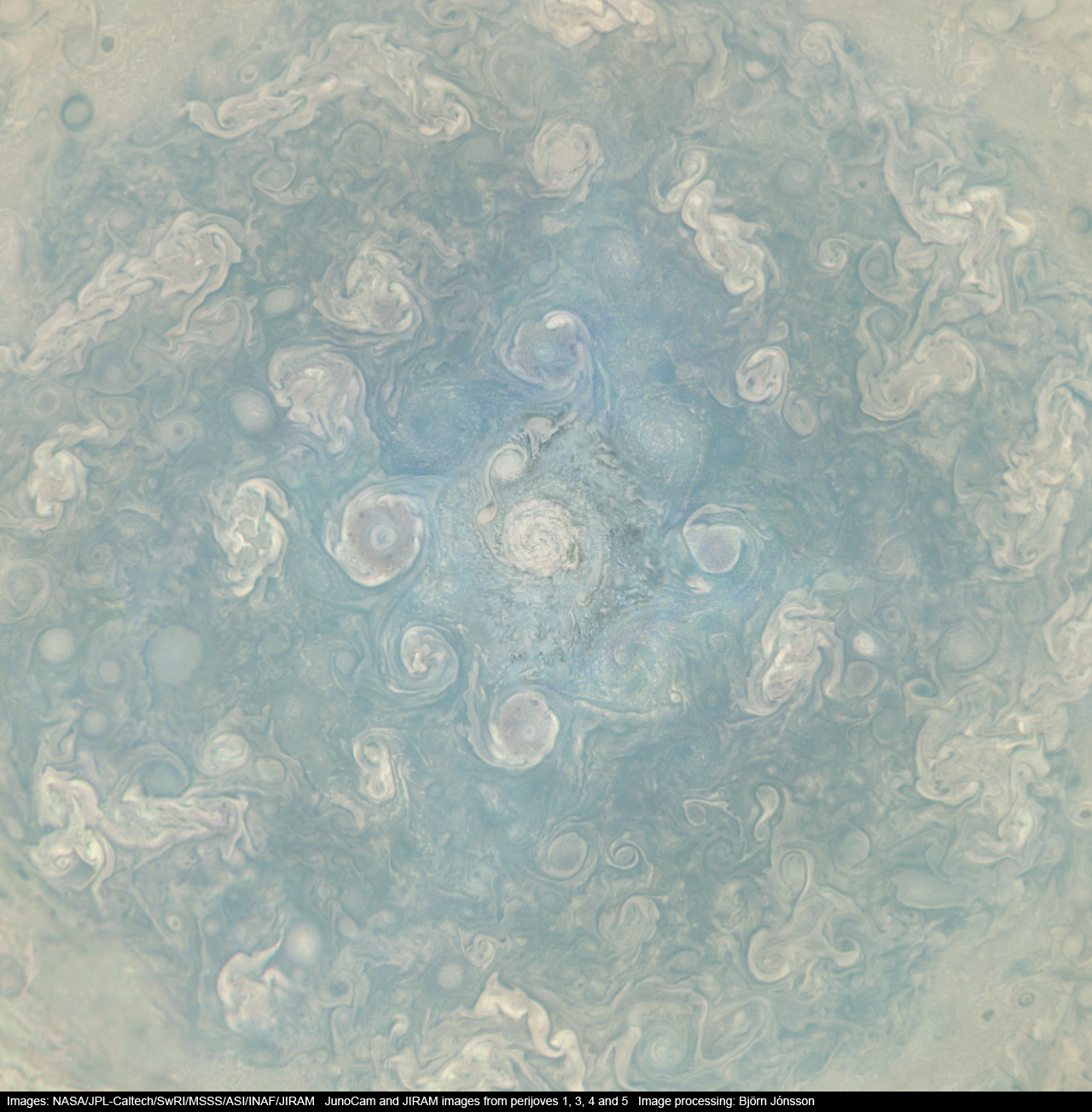 Here is a mosaic of JunoCam images from perijoves 1, 3, 4 and 5. The effects of the varying global illumination have been removed. The mosaic shows Jupiter's north polar region in orthographic projection from directly above. Because the north pole is in winter darkness, an inverted, heavily processed and colorized JIRAM mosaic was used to fill the gap at the north pole. This represents an attempt to guess what this area might look like in visible light. Small scale details in the cloud morphology should be fairly accurate/realistic but the overall contrast, brightness and color are more uncertain. They are based partially on a visual comparison of the JunoCam and JIRAM data farther from the pole where useful data from both instruments is available. It is difficult to guess how accurate this is but it is definitely far better than leaving this area blank. Unfortunately we will not be seeing all of this area clearly in visible light any time soon unless Juno lasts well into the 2020s (JUICE will also be orbiting Jupiter during northern hemisphere winter).