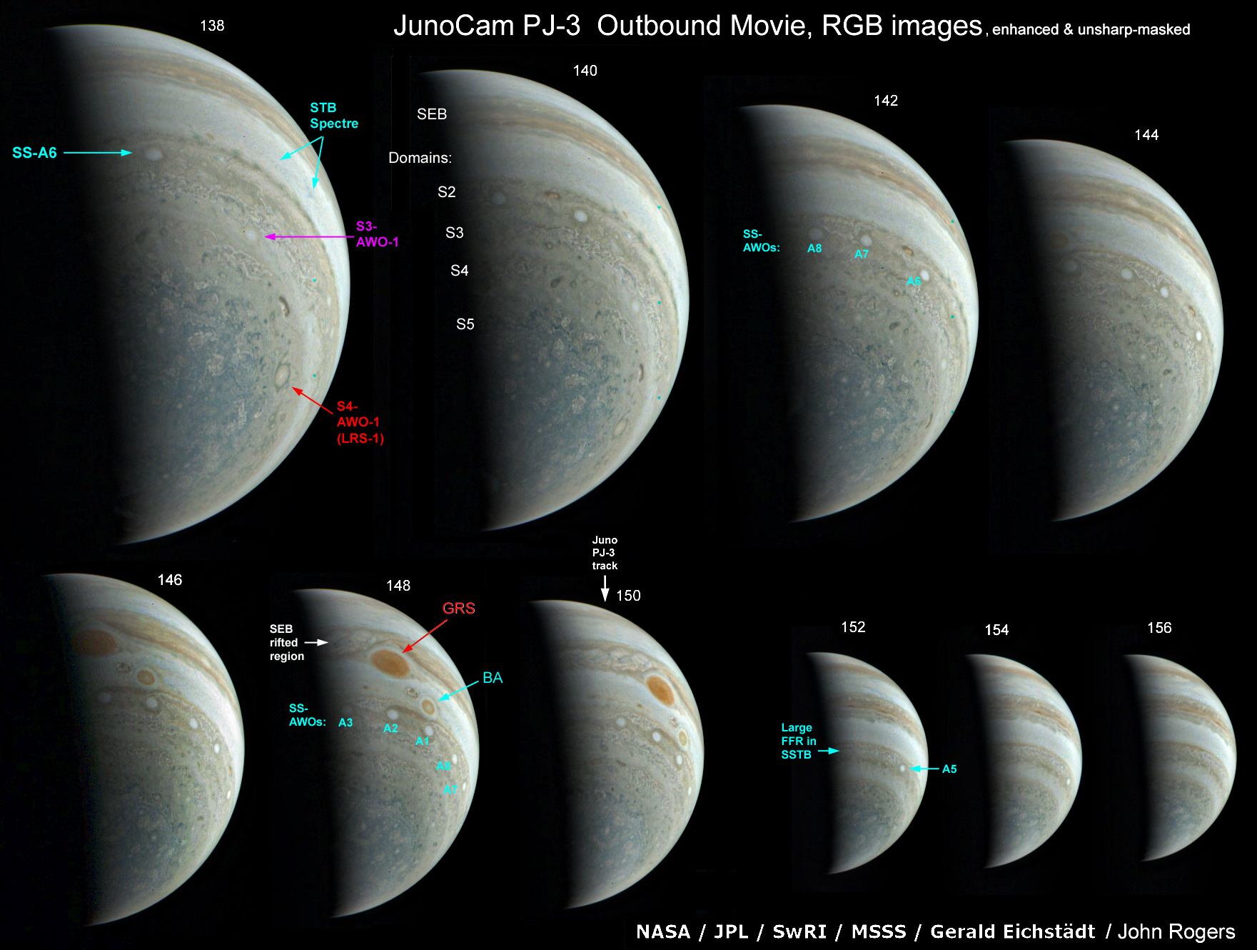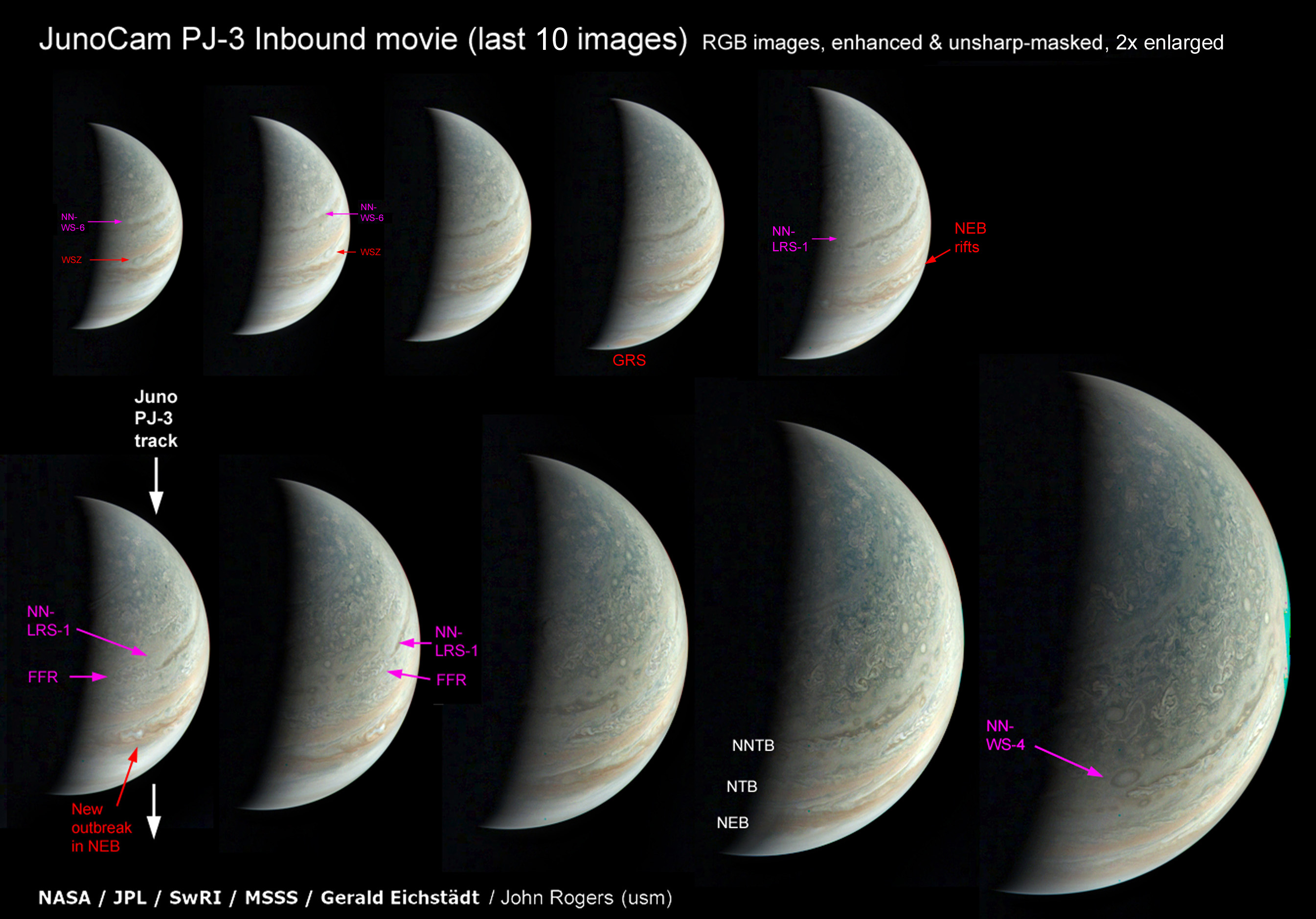 John and Gerald have provided this mapping of atmospheric features. JunoCam captured a marble movie inbound and outbound for context.