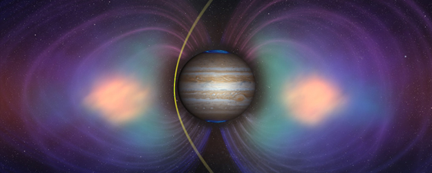 Most of these particles, which are ionized and swept up by the field, come from the volcanic gases spewing from Jupiter’s moon Io.