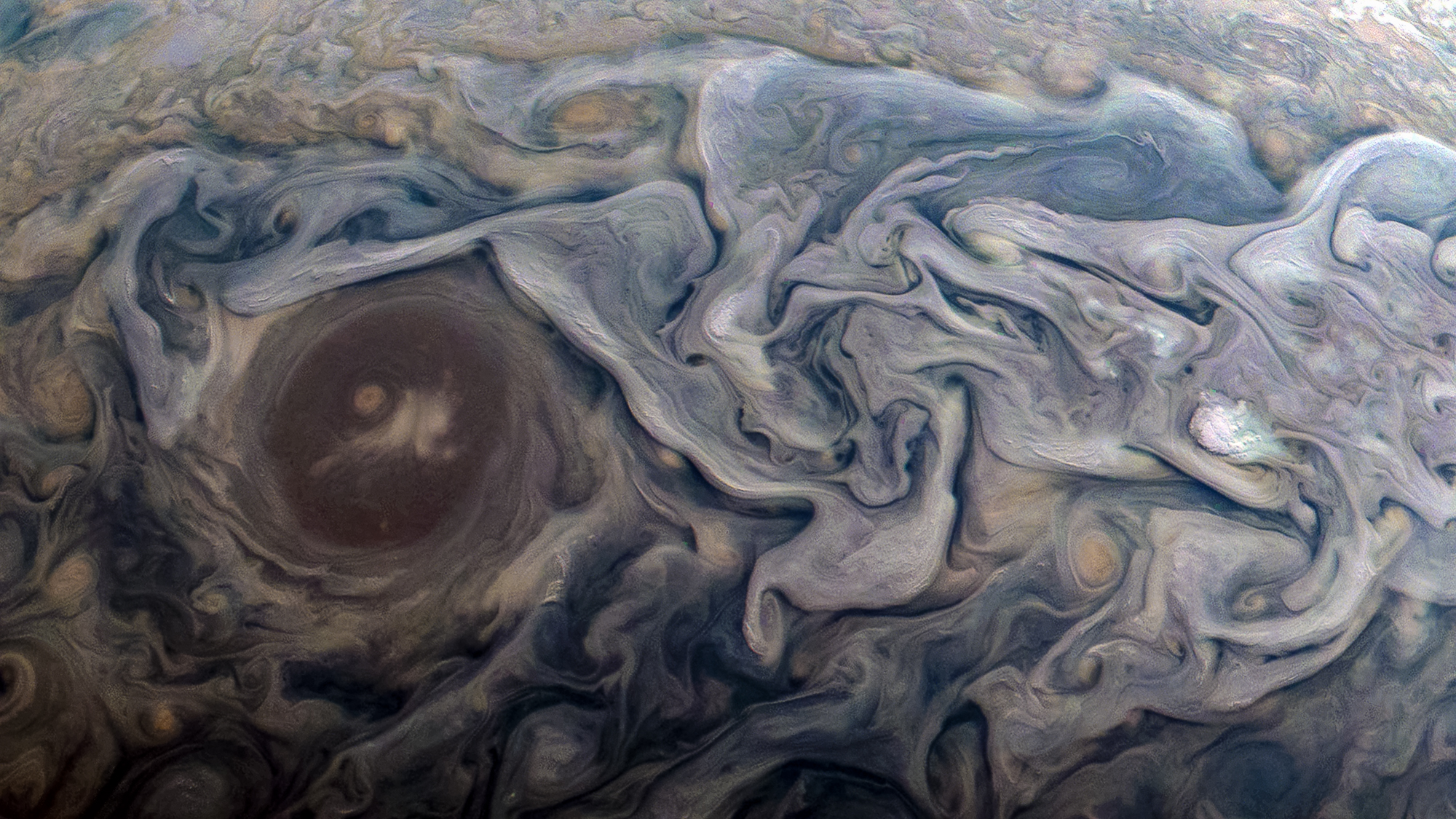 Dramatic atmospheric features in Jupiter's northern hemisphere are captured in this view from NASA's Juno spacecraft. The new perspective shows swirling clouds that surround a circular feature within a jet stream region called "Jet N6."
