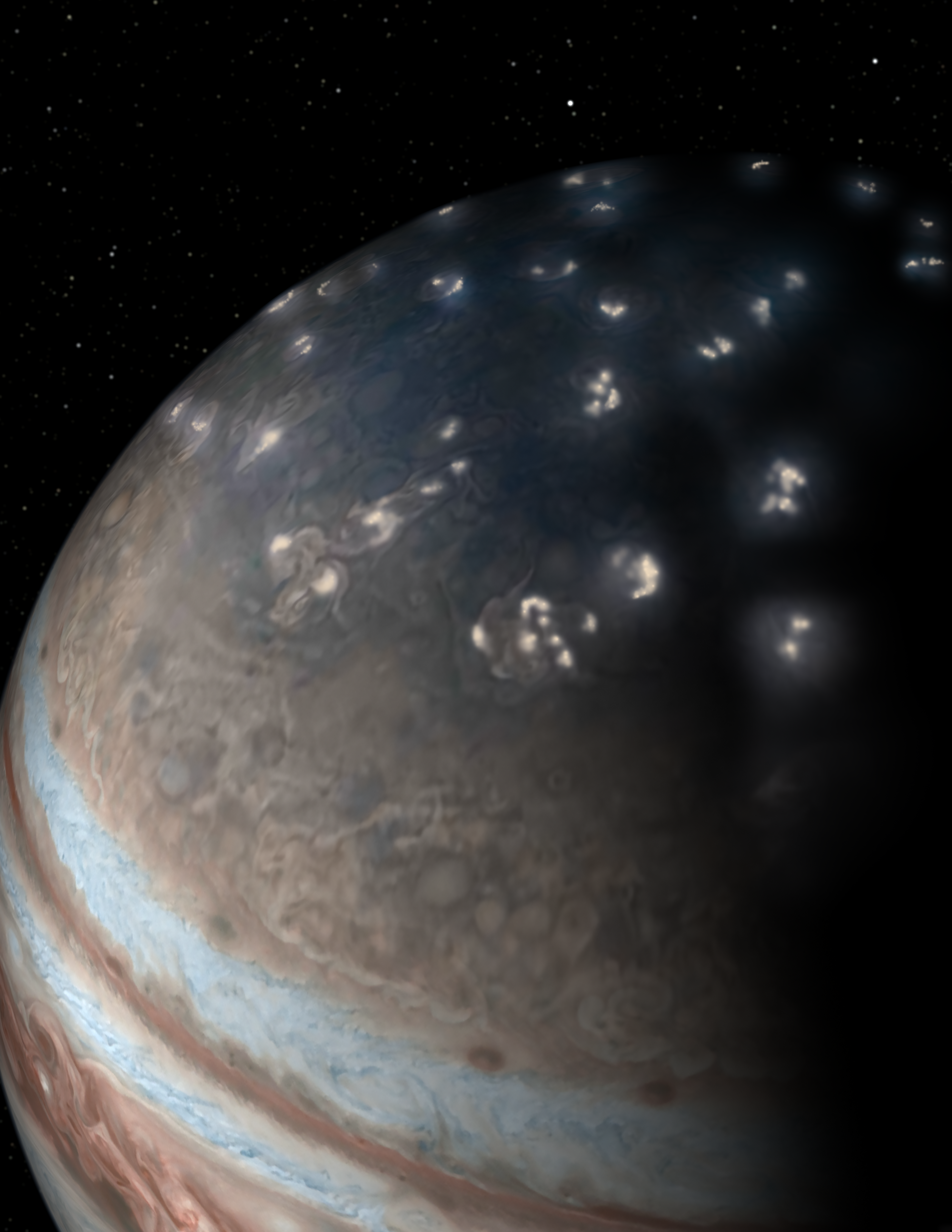 This artist’s concept of lightning distribution in Jupiter’s northern hemisphere incorporates a JunoCam image with artistic embellishments. Data from NASA’s Juno mission indicates that most of the lightning activity on Jupiter is near its poles.