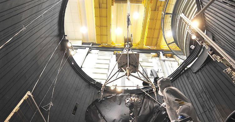 In the image, a technician is attaching the lifting equipment in preparation for hoisting the 1,588-kilogram (3,500-pound) spacecraft out of the chamber. Prominent in the photo is one of three large, black, square solar array simulators, which reproduced the thermal properties of Juno's large solar arrays.