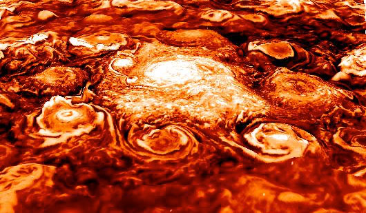 In this composite infrared image, derived from data collected by the Jovian Infrared Auroral Mapper (JIRAM) instrument aboard NASA’s Juno mission to Jupiter during a Feb. 2, 2017, pass over the planet, shows the central cyclone at the planet’s north pole and the eight cyclones that encircle it. JIRAM collects data in infrared, and the colors in this composite represent radiant heat: the yellow (thinner) clouds are about 9 degrees Fahrenheit (-13°Celsius) in brightness temperature and the dark red (thickest) are around -181 degrees Fahrenheit (83°Celsius).