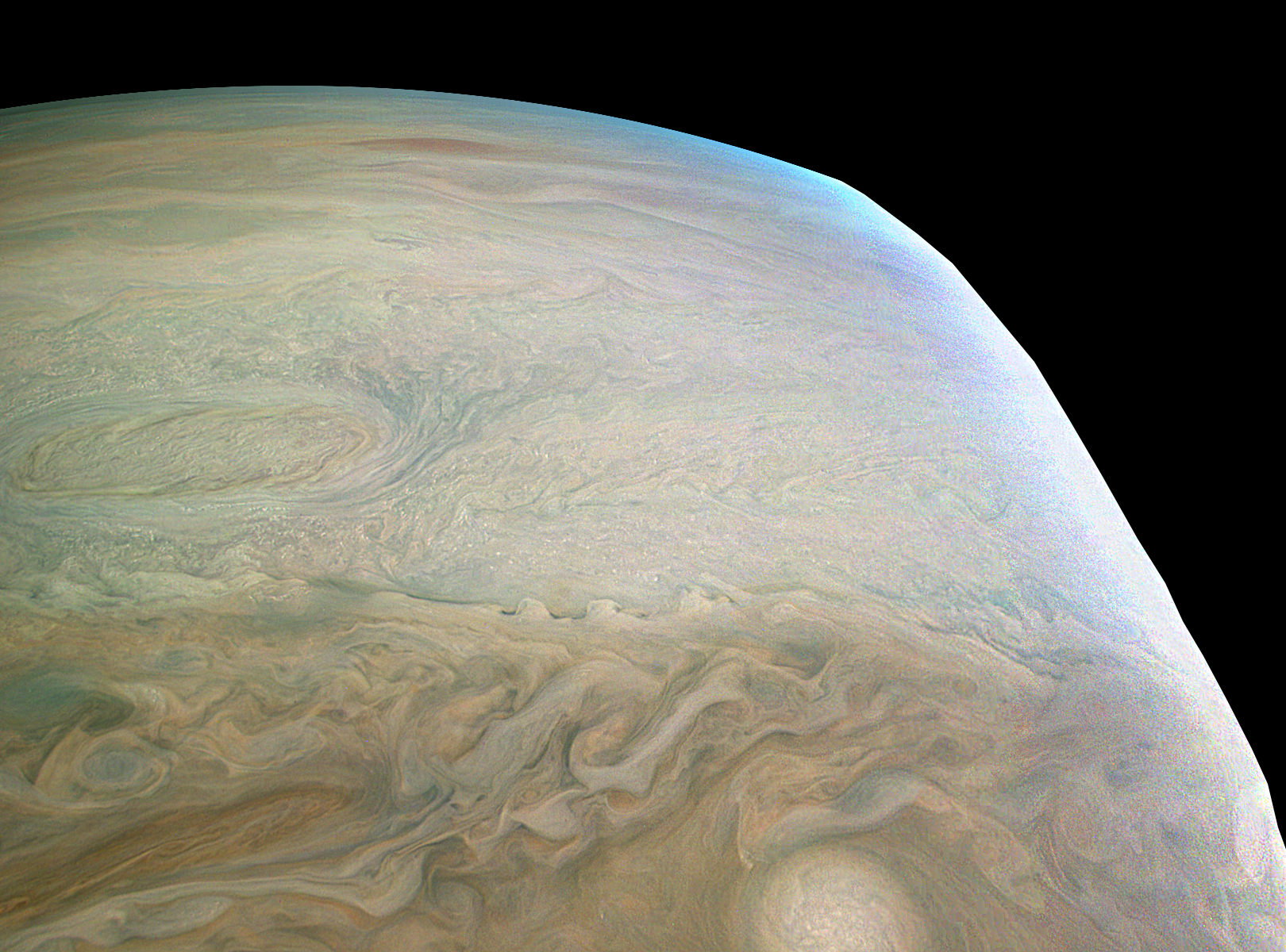 Prior to Juno’s fifth flyby over Jupiter’s mysterious cloud tops, members of the public voted on which targets JunoCam should image. This picture captures not only a fascinating variety of textures in Jupiter’s atmosphere, it also features three specific points of interest: “String of Pearls,” “Between the Pearls,” and “An Interesting Band Point.” Also visible is what’s known as the STB Spectre, a feature in Jupiter’s South Temperate Belt where multiple atmospheric conditions appear to collide.
