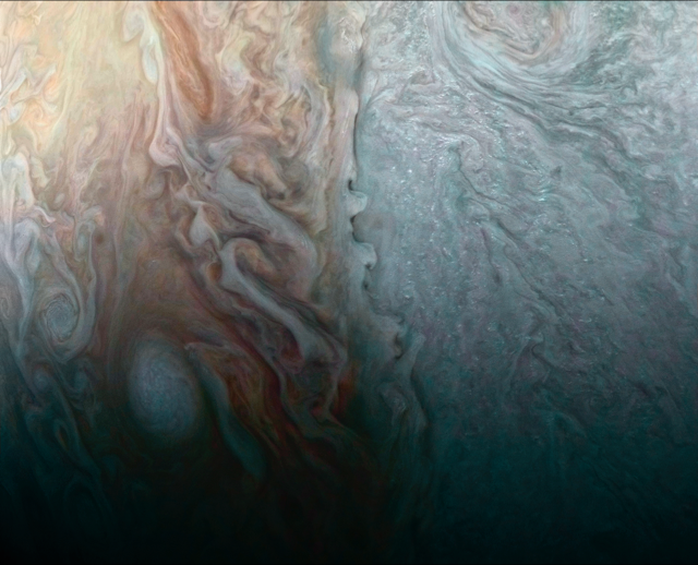 highlights a feature on Jupiter where multiple atmospheric conditions appear to